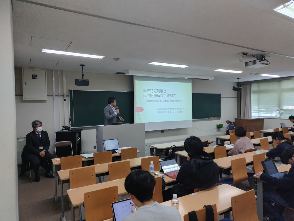 当会会員が岡山大学法学部において、不動産登記法bの授業を行いました。 講義内容 不動産登記法 各論11(筆界特定制度と民間紛争解決制度1)、各論12(筆界特 …